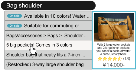 Comprehensive shopping guidance will become possible by gathering together all kinds of data. Simply displaying a large amount of information is not the goal. Rather, MARS EXPLORER actively guides users to products with a visually appealing UI using thumbnail images and icons, having accurately gauged user needs from the entered text.